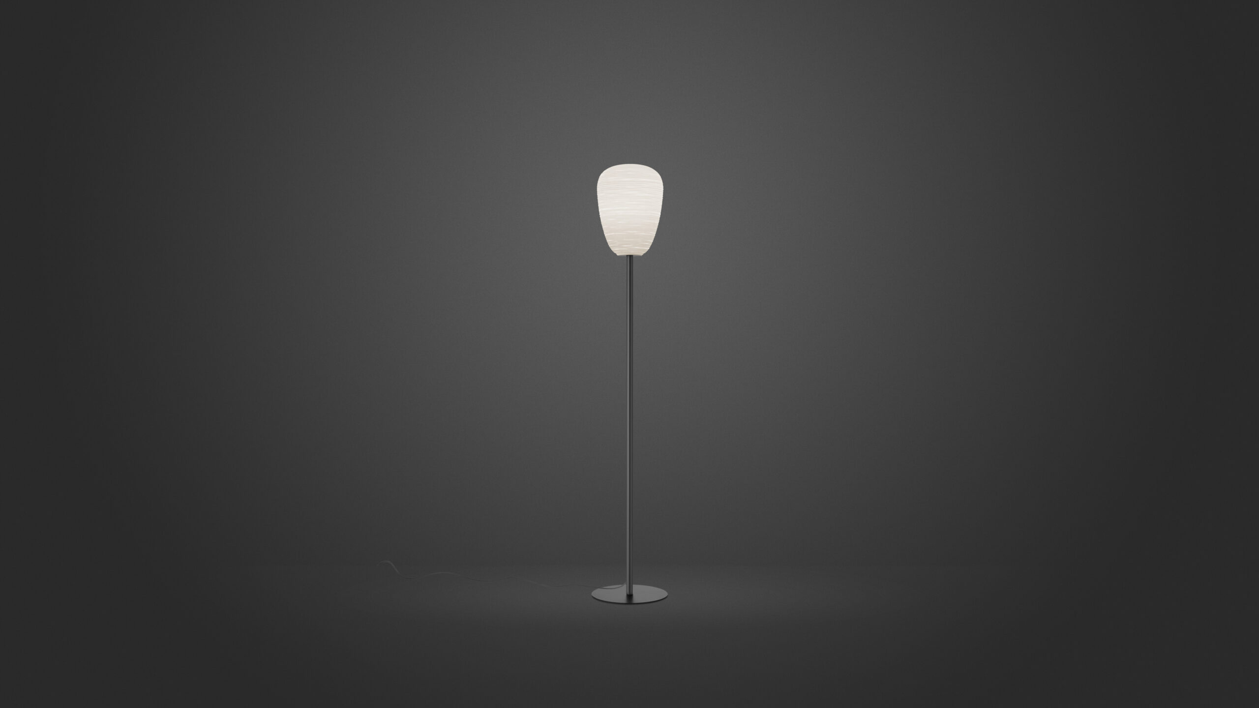 東洋の伝統的な紙製のランタンからインスピレーションを得たフロアランプ Rituals。ハンドメイドの吹きガラスに細かく刻まれた模様がデコラティブでありながら、温かみがあり柔らかな光をフィルタリングします。