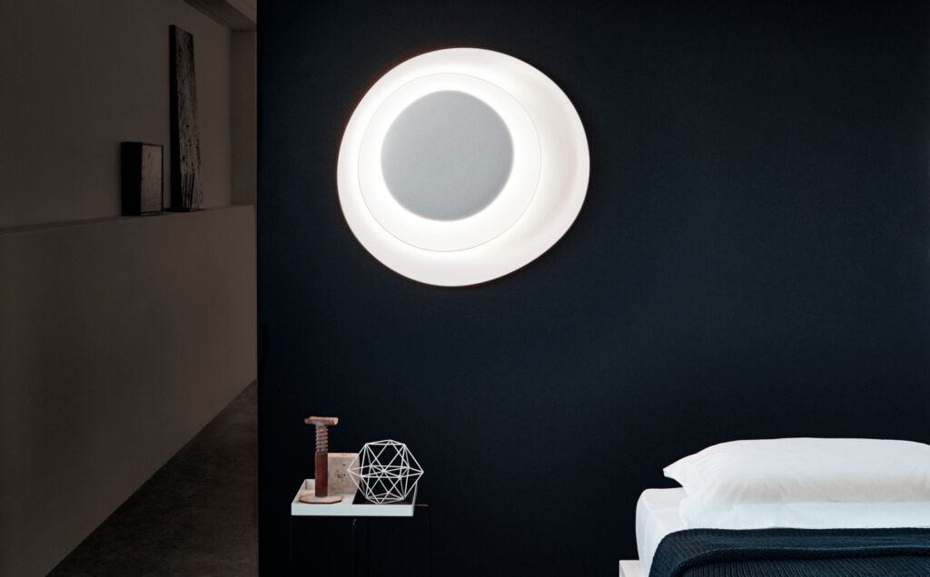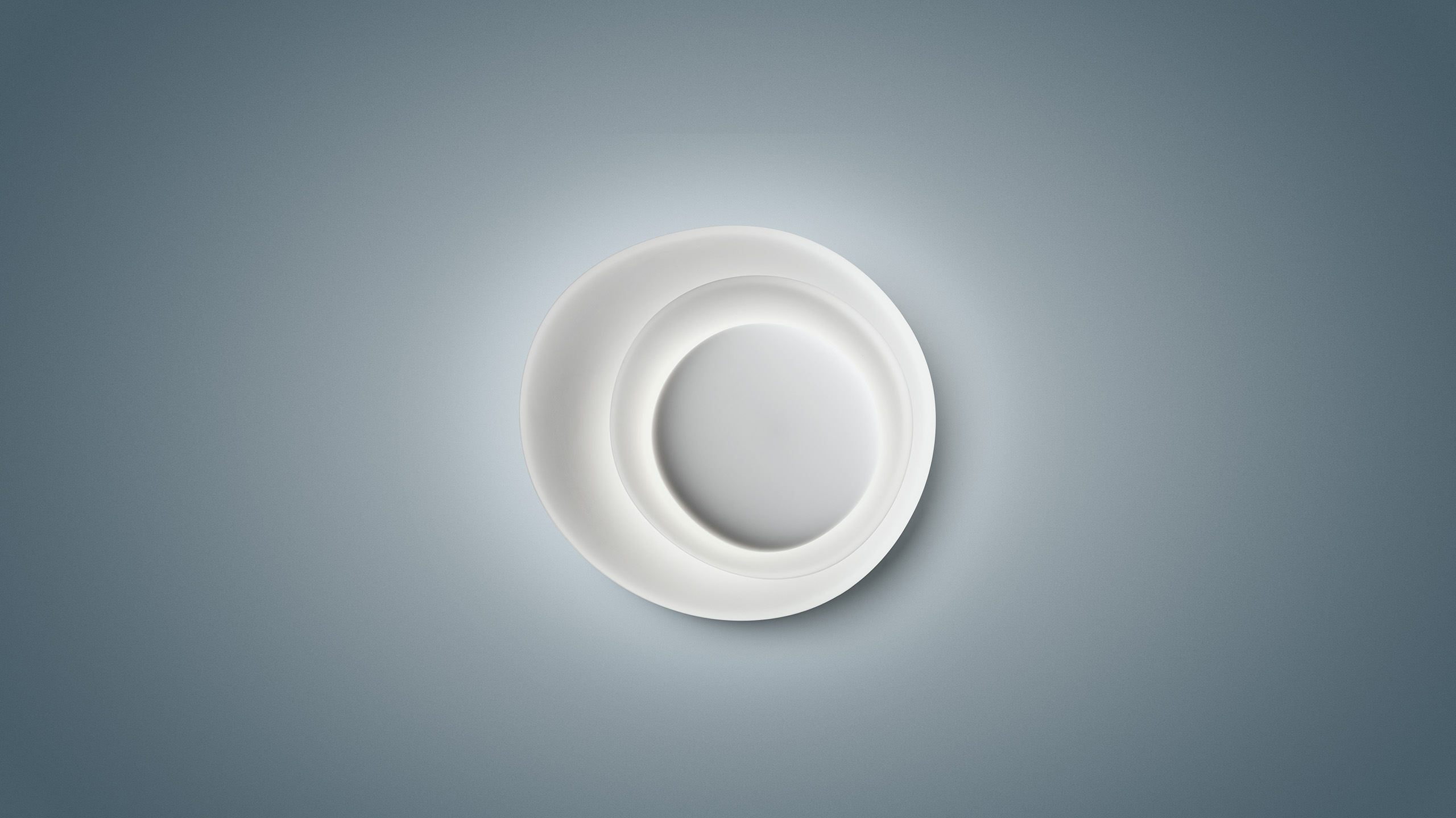 Una soluzione versatile,a luce riflessa e diffusa, che offre flessibilità di installazione sia come lampada da soffitto sia a parete. Il suo design seducente richiama la visione aerea di un arcipelago che irradia le sue sfumature descrivendo aree concentriche. Formata da tre piatti ovaloidi in policarbonato opaco bianco stampati ad iniezione e montati asimmetricamente. Il piatto più grande funge da attacco a parete, i due piatti centrali celano la parte illuminotecnica e l’alimentatore elettronico. Arreda lo spazio con uno spessore ridotto, anche grazie alla possibilità di creare composizioni multiple insieme al modello più piccolo, per disegnare arcipelaghi luminosi a soffitto.