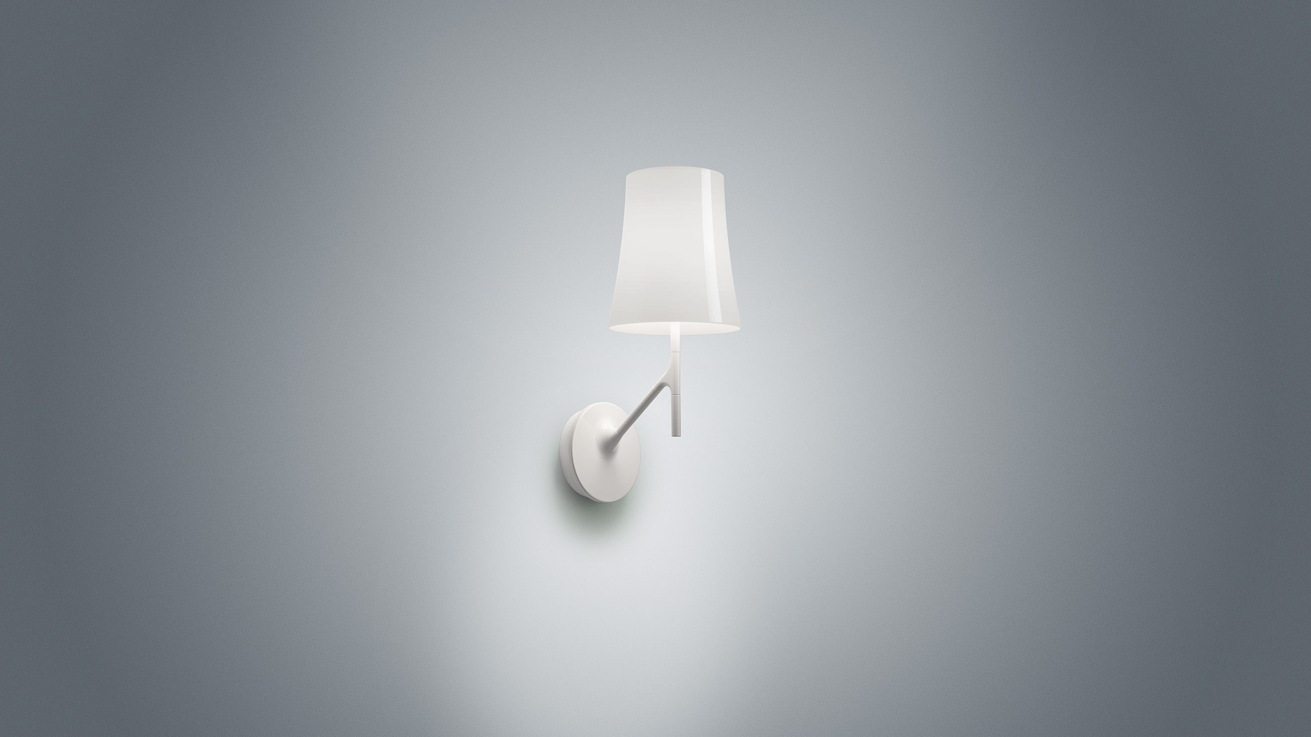 Lampada da parete a luce diffusa. Piastra di fissaggio a parete e rosone di copertura in pressofusione di zama verniciata a liquido, braccio e supporto diffusore in acciaio verniciato a liquido. Diffusore interno opalino in policarbonato e diffusore esterno in policarbonato traslucido entrambi stampati a iniezione. Nella versione con touch dimmer il sensore è localizzato sul finale del braccetto, disegnato come un ramoscello, pronto ad accogliere un uccellino, da cui il nome“birdie” in inglese.