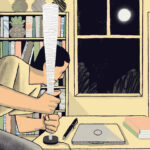 In realtà mi sono divertito non tanto con una singola illustrazione quanto con il fatto di aver avuto la possibilità di creare, sfruttando i sei soggetti distribuiti su due righe, una serie simmetrica che racconta il ciclo del giorno e della notte. La narrazione è un aspetto fondamentale di qualsiasi opera visiva e l’estetica non dovrebbe mai essere fine a se stessa.