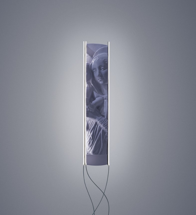 Eine Wandleuchte mit starker darstellender und dekorativer Präsenz auch im ausgeschalteten Zustand, die ein angenehmes Raumlicht abgibt, wenn sie eingeschaltet ist. Fregio ist eine Leuchtskulptur, die aus einem blumigen Flachrelief aus glasierter Keramik und LEDs besteht, welche einen modernen Ansatz mit der antiken Handwerkskunst der dekorierten Keramik vereint.