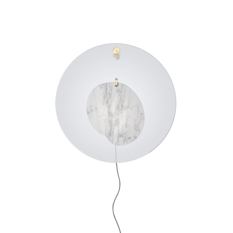 Wandleuchte mit diffusem und reflektiertem Licht. Die Leuchte besteht aus einer lasergeschnittenen PMMA-Scheibe, in deren Mitte eine Platte aus weißem italienischem Carrara-Gioia-Marmor mit hellgrauen Adern positioniert ist. Der Ring und der Stift zur Befestigung an der Wand sind aus glänzendem Messing gefertigt. Der LED-Chip ist durch eine durchscheinende Polycarbonat-Kapsel geschützt, die auf einer Halterung aus lackiertem Aluminium befestigt ist. Die Ausführung mit 220 V wird über ein rundes graues Textilkabel mit Strom versorgt. Mit schwarzem Ein/Aus-Schalter und schwarzem Stecker. Kabel abnehmbar.