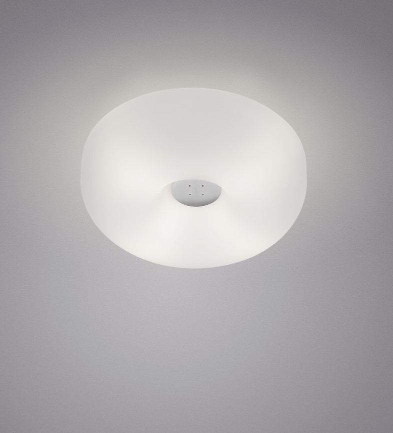 Familie von Lampen mit diffusem Licht. Weiß satiniertes mundgeblasenes Diffusorglas, hergestellt mit einer Blastechnik, bei der das Glas nicht in der Gussform gedreht wird (genannt “a fermo”) und dann einer Säureimmersion unterzogen wird. Befestigung und Anbau aus mit Epoxidpulver lackiertem Metall und Lampenhalterstütze aus matt eingespritztem transparentem Polycarbonat. Einige Versionen bieten Flexibilität für die Wand- oder Deckenmontage. In der Wandversion ‘Mirror’ ermöglicht ein spezielles Ringsystem die Installation am Spiegel als perfekte Schminkleuchte.