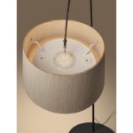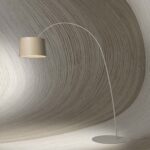 Stehleuchte mit direktem und indirektem Licht. Der Diffusor besteht aus zwei einander überlappenden Blättern aus gebleichtem Ahornholz. An der Ober- und Unterkante des Diffusors sorgt ein wenige Millimeter dicker Bambusring dafür, dass die Blätter ihre Form behalten. Der Schaft besteht aus flüssiglackiertem GlasfaserVerbundmaterial, der runde Sockel aus pulverbeschichtetem Metall. Im Lieferumfang enthalten sind vier Gegengewichte, die über dem Schirm anzubringen sind und der Höhenregulierung dienen. Auf Anfrage mit zusätzlichen Elementen zur Verlängerung des Bogens erhältlich. Auf dem durchsichtigen Kabel befindet sich ein Dimmer, der sowohl zur stufenlosen Regulierung der Lichtstärke wie auch als Ein-/Ausschalter dient.