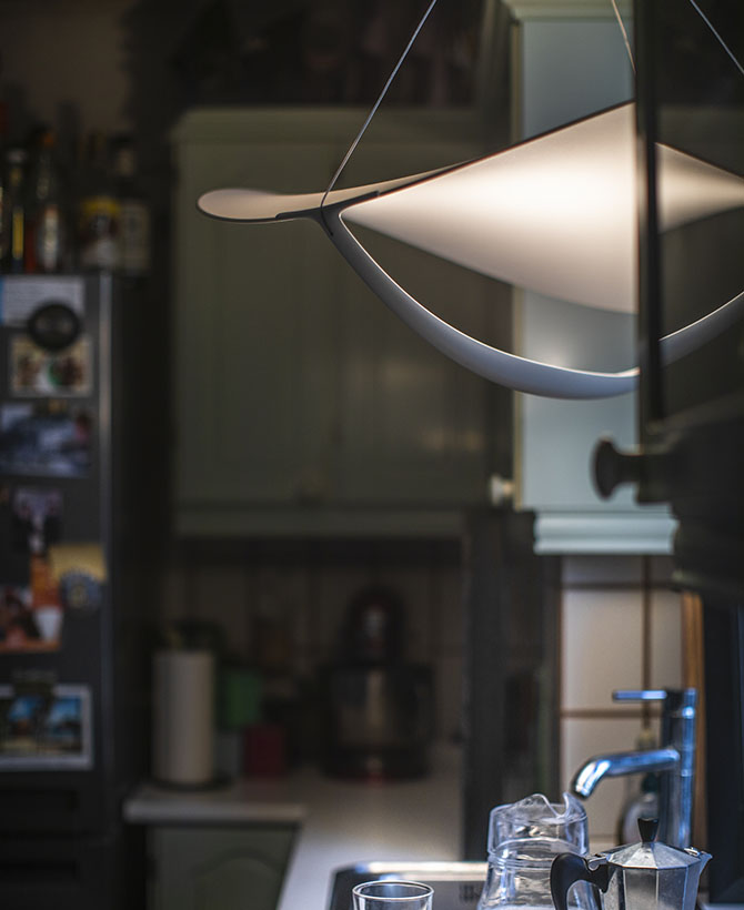Plena is like a cradle containing and concealing the light source. The fabric looks like a veil blowing in the wind and it retains its shape without needing any supports, with a perfectly natural design.
