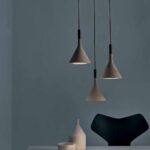 Compact suspension lamp with direct light. Cement diffuser, consisting of a special amalgam coloured with pigments, produced by pouring the fluid mixture into a mould. Ceiling canopy with galvanised metal bracket and batch-dyed ABS cover. Black electrical cable and canopy for the brown and grey version, white for the white version. Canopy decentralisation kit – multiple canopy available (up to 9 suspension lamps).