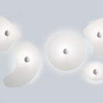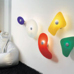 More than a family of wall lamps, Bit is an alphabet of organic shapes and basic colours, with which to create endless compositions. When off, they recall a surrealist painting, when on the play of light of mosaic glazing.