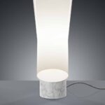Designed by Rodolfo Dordoni, Nile is a decorative lamp of remarkable character, with diffused and direct, downward and upward light. It embodies the perfect balance of two opposites, the delicacy of the diffuser made of white jacketed blown glass and the consistency of the polished marble base, with a unique handcrafted matte-finish. Carrara marble for the white version and Marquina marble for the black version. The lower surface of the base is protected by a rubber scratch-proof disk. The base and the diffuser, at different angles, remain in place thanks to an invisible game of weights, positions and joints in a dynamic composition. Already beautiful when off, it takes on even more allure when the light filters through the precious blown glass, shining down to the surface below and upward through the two open sides of the diffuser.