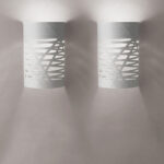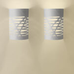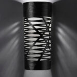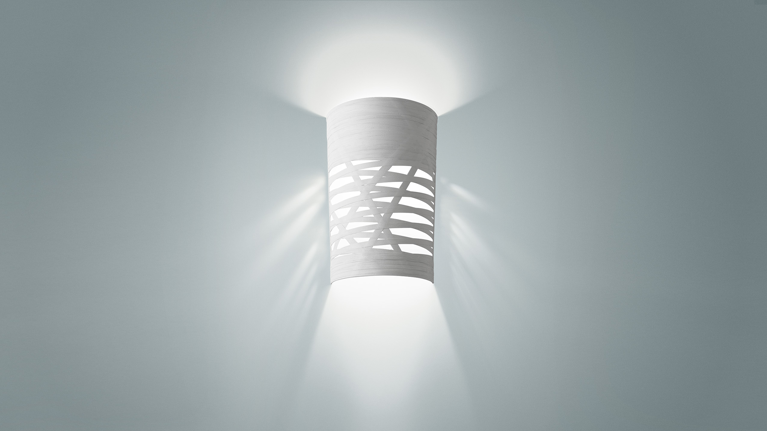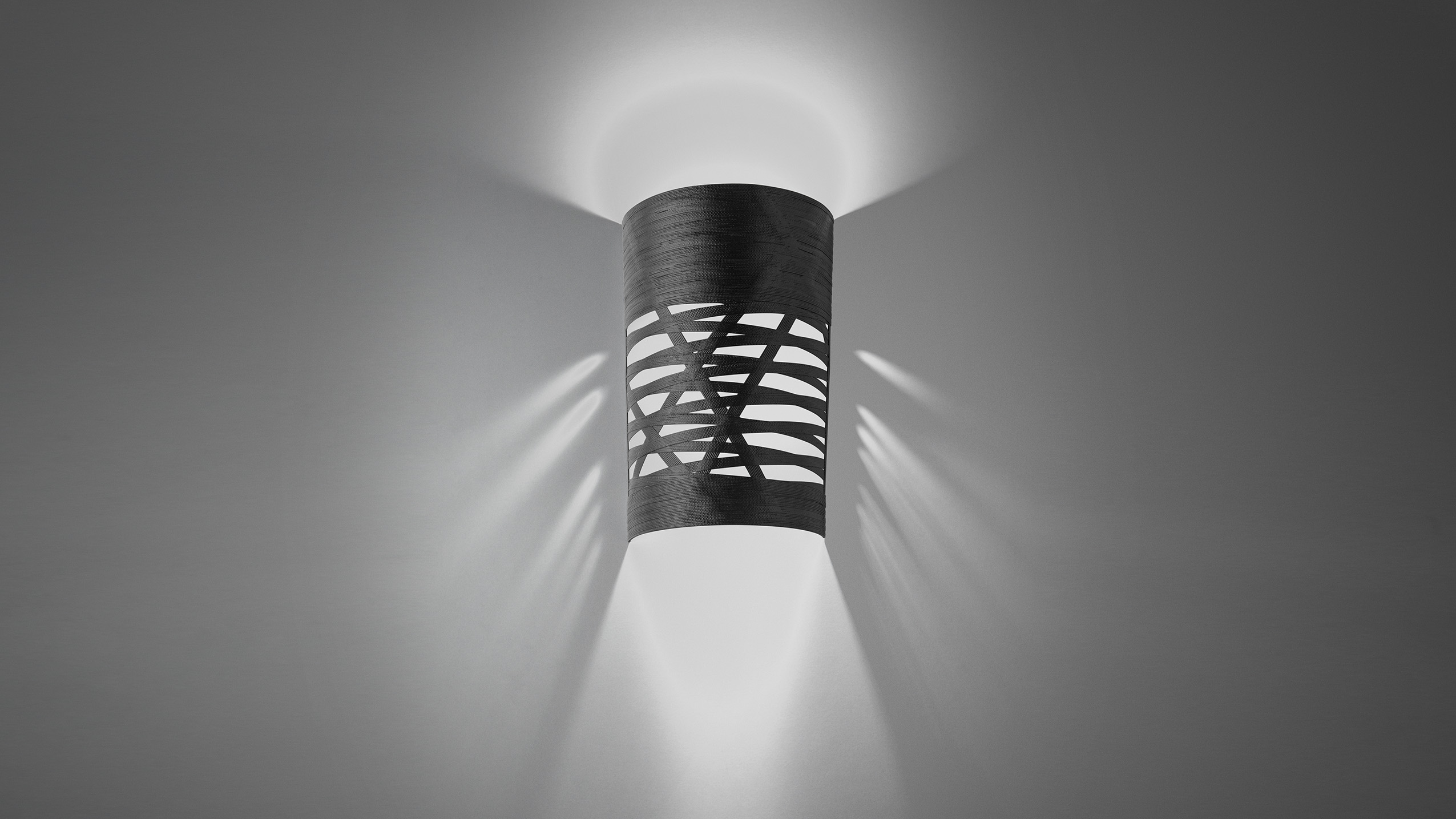 The Tress wall lamps are available in two sizes, and they create a graphic and scenic effect thanks to the light that filters through woven composite material.