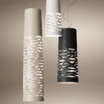Suspension lamp with diffused and direct light. The fibreglass-based composite material diffuser is produced by modelling tape along a mould with an automatic control of the pitch/pattern, which is then liquid coated. In the large version, blown glass internal diffuser with acid etched finish, satin finish opaline glass upper screen and chromed metal frame, in the other versions chromed metal mount. Fitted with three stainless steel suspension cables for the large version, one for the other versions, and transparent electrical cable. Ceiling canopy with galvanised metal bracket and glossy chromed batch-dyed ABS cover. Canopy decentralisation kit – multiple canopy available (up to 6 or 9 suspension lamps).