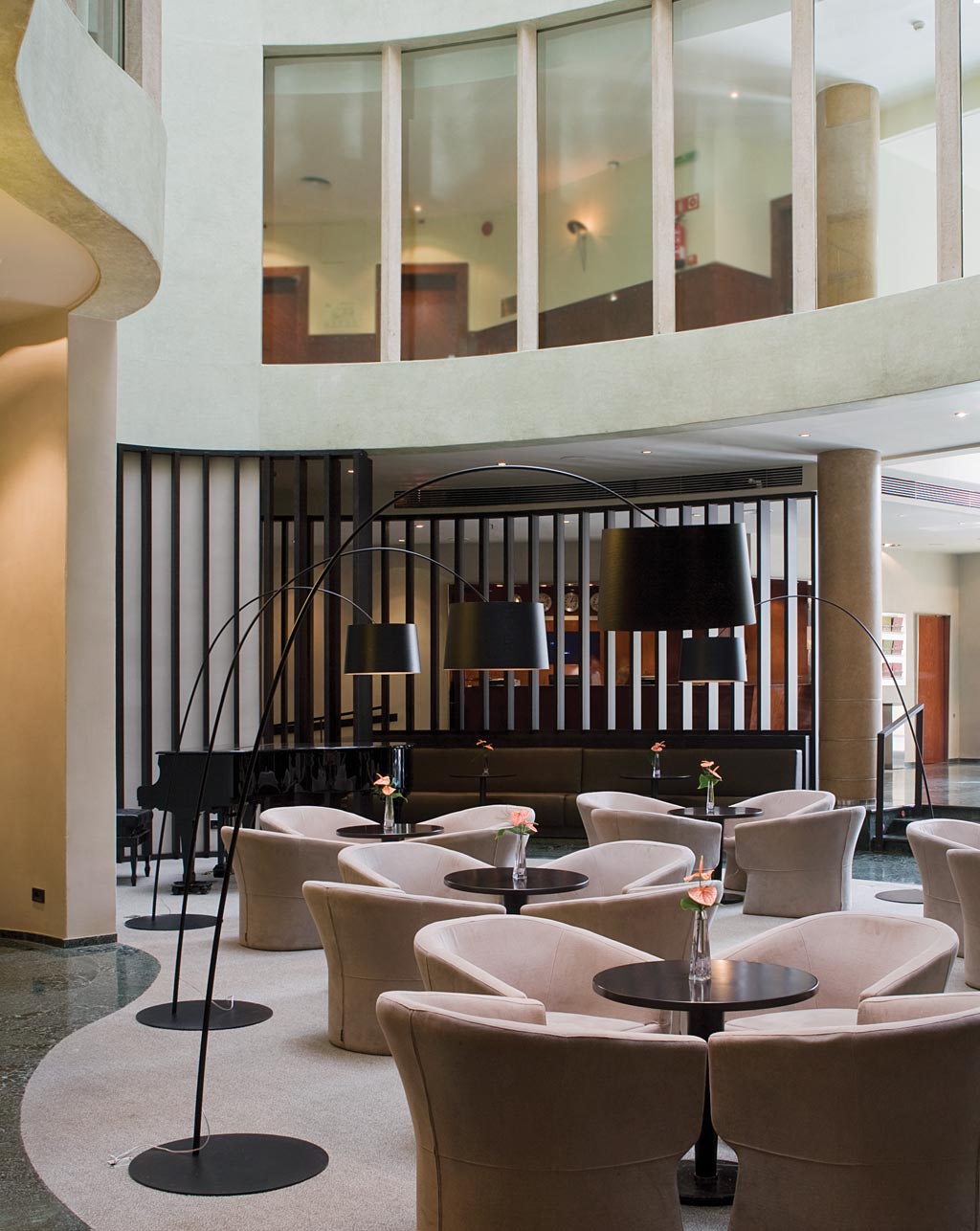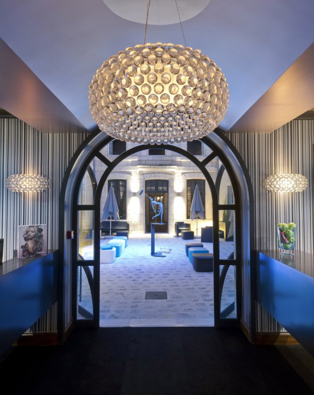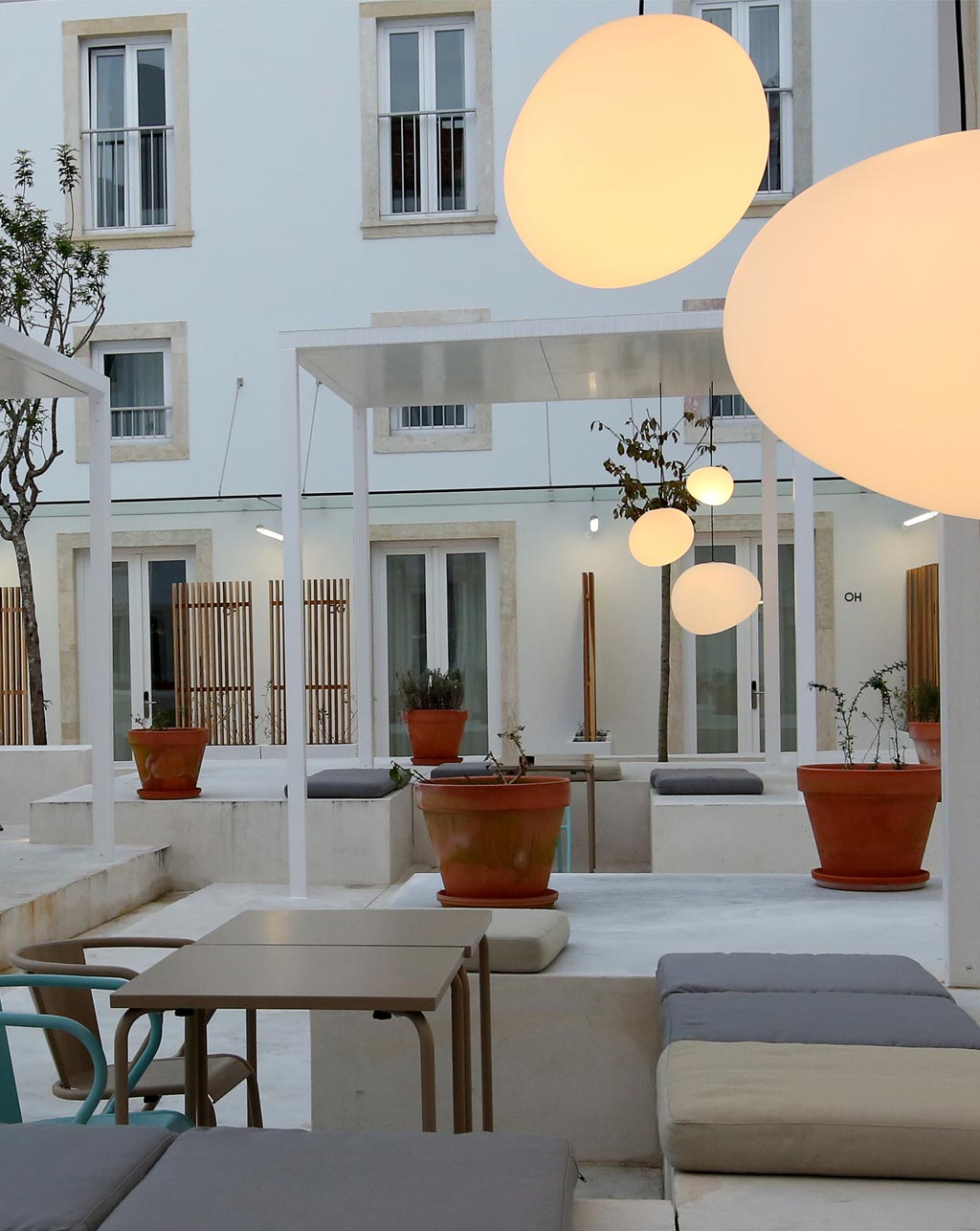 Las lámparas Gregg combinan armoniosamente con el blanco de los espacios comunes exteriores de este hotel, ubicado en un antiguo convento. Acogedores glorietas, situadas estratégicamente, crean ambientes más cálidos e íntimos en el gran espacio abierto. Dentro de estas islas, las formas orgánicas y suaves de las lámparas Gregg outdoor, dispuestas en varios tamaños y alturas, ayudan a decorar, iluminar y suavizar la arquitectura limpia y la rigurosa geometría de la plaza.
