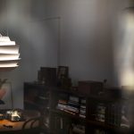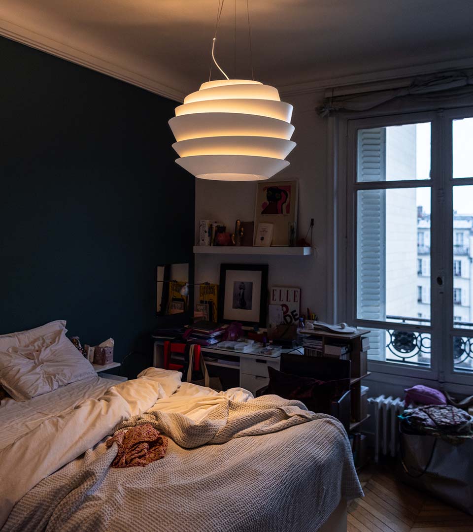 La utilización de un material que no deja pasar la luz ayuda a crear el maravilloso efecto luminoso de esta lámpara, con haces de luz proyectados hacia arriba y una iluminación directa hacia abajo.