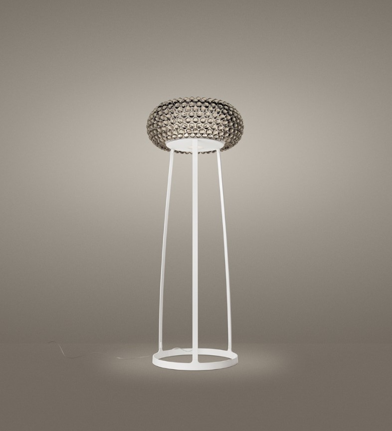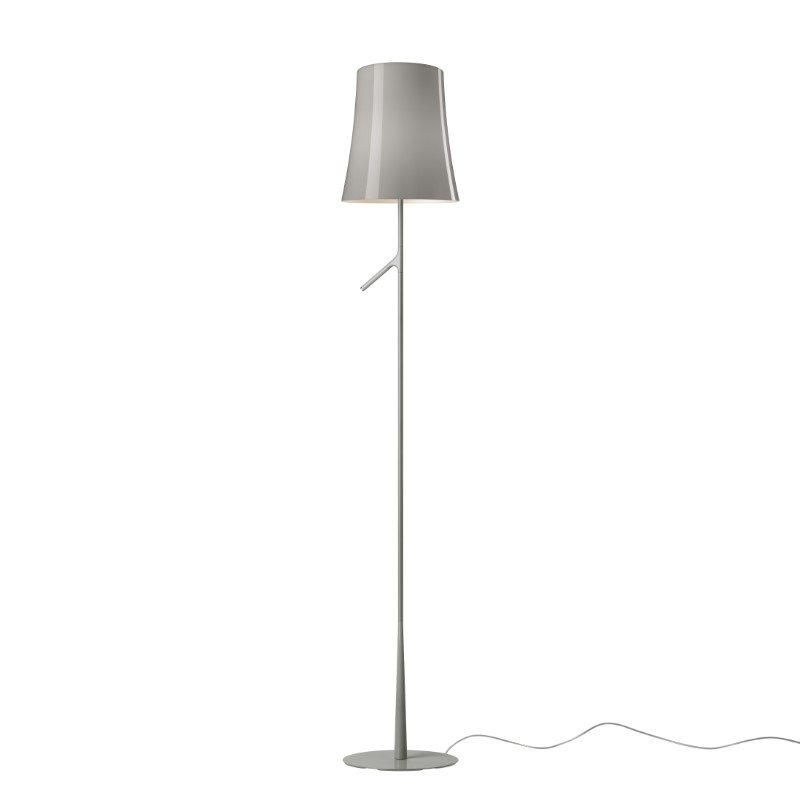 Lámpara de pie y de lectura de luz difusa y directa. Un modelo que combina un rasgo ligero y familiar y un carácter decidido. Siempre monocromática, Birdie de pie asume diversas personalidades según su color. Base en aleación de zinc fundido bajo presión y vástago en acero, ambos pintados con líquido. Difusor interno opalino en policarbonato y pantalla externa en policarbonato translúcido, ambos moldeados por inyección. El sensor del touch dimmer se encuentra al final del brazo del vástago y permite la regulación por pasos de la intensidad luminosa; transformador electrónico en el cable transparente. En la versión sin dimmer el interruptor on/off se encuentra en el cable transparente.