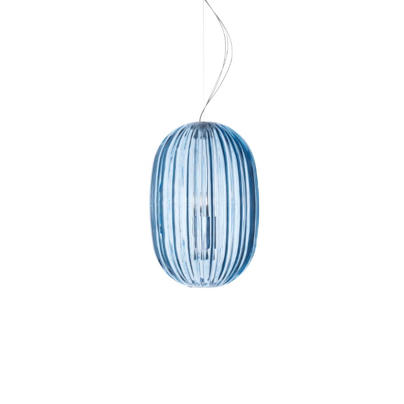 Una lámpara de suspensión que se inspira, en la forma y en los colores, en las perlas de vidrio de la tradición veneciana, pero se realiza en policarbonato transparente. La superficie se caracteriza por unas ligeras imperfecciones que recuerdan el vidrio artesanal y hacen vibrar la luz. Dos medidas para proyectos a gran escala o más reducidos.