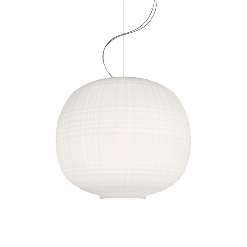 Un vidrio soplado de gran personalidad, obtenido gracias a una técnica de soplado a boca especial, que recrea el efecto del famoso tejido escocés. La lámpara de suspensión Tartan se caracteriza por líneas y pliegues que recorren su superficie, generando un original juego gráfico de luces y sombras.