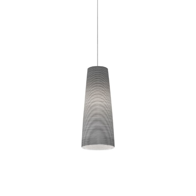 Compacta y armoniosa, la lámpara de suspensión Tite 2 se ha creado con una inconfundible mezcla de hilo de carbono negro y fibra de vidrio: una síntesis genial entre decoración gráfica y estructura funcional. Cuando está encendida, la luz resalta la decoración y proyecta hacia abajo un intenso y cálido haz luminoso.