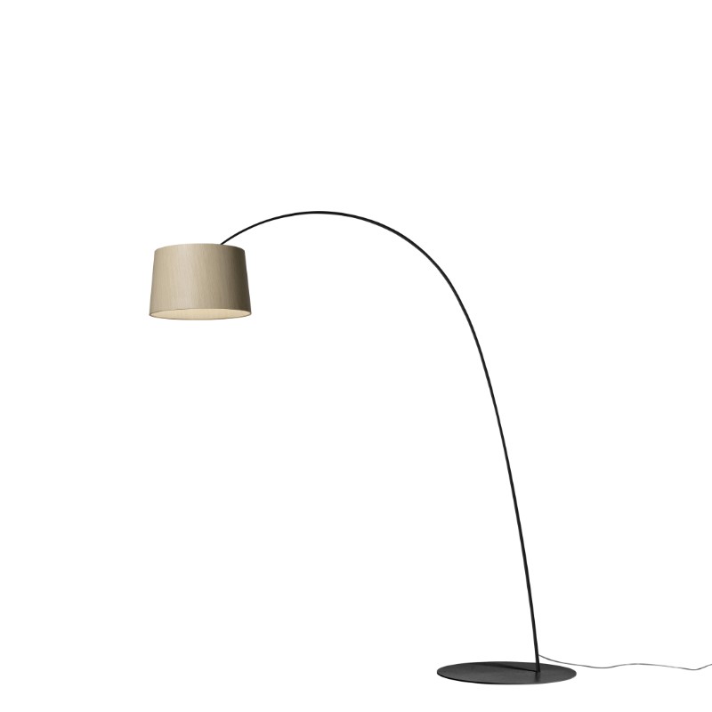Lámpara de pie de luz directa e indirecta. El difusor se obtiene con la superposición de dos láminas de madera de roble blanqueado y dispone, en la parte superior e inferior, de un anillo de bambú de pocos milímetros de grosor para garantizar la circunferencia. El poste es de material compuesto sobre base de fibra de vidrio pintada con líquido. Base circular de metal pintado con polvos epoxídicos. Se entregan de serie 4 contrapesos que se colocan en el alojamiento correspondiente encima del difusor para regular su altura. Es posible solicitar varillas adicionales para extender el arco. El cable transparente dispone de un regulador de luz que actúa como regulador de la intensidad luminosa gradual y como interruptor on/off.