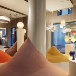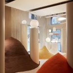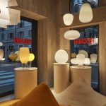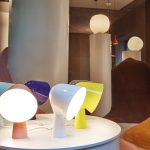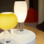 Las protagonistas del primer escaparate en Corso Monforte son las casuales y coloridas Binic de Ionna Vautrin, pequeñas luces de mesa capaces de suscitar una simpatía inmediata por su formas lúdicas. Al lado, ocupan la escena las luces de suspensión y de mesa Rituals de Ludovica + Roberto Palomba, caracterizadas por la especial elaboración del vidrio soplado, repleto de ligeras ondulaciones que crean una iluminación cálida y vibrante. Se presentan cerca de las lámparas de mesa Buds de Rodolfo Dordoni, una colección refinada en la que el vidrio soplado es el protagonista absoluto, combinado con una base transparente que valoriza su pureza formal. También captura la atención la escenográfica lámpara de suspensión Big Bang de Vicente García Jiménez y Enrico Franzolini y la dinámica y ligera Plena de Eugenio Gargioni y Guillaume Albouy, una luz con un encanto e interés especial, capaz de iluminar completamente una habitación manteniéndose de todas formas suave y envolvente.