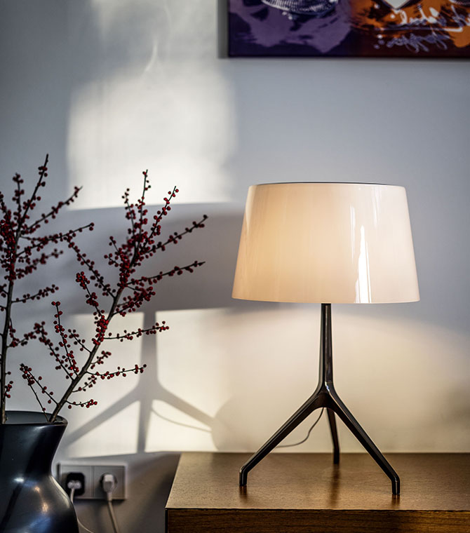 La lampe Lumiere XX est une réinterprétation du projet original Lumiere avec de nouvelles proportions. Le trépied est toujours en métal, mais avec un signe plus décisif, tandis que le diffuseur en verre soufflé acquiert de nouvelles géométries, soufflées à la bouche avec un savoir-faire artisanal.
