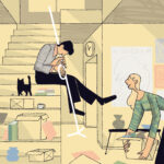 « Instinctivement, j’utilise toujours la figure humaine dans mon travail ; il est rare que je crée un paysage sans personnes ou autres sujets. L’être humain devient ainsi le protagoniste de mes œuvres, et ses émotions forment la base à partir de laquelle je construis mes histoires. À travers les protagonistes, on peut lire et deviner ce qui se passe, quelle est l’histoire, quelles sont les situations et les événements qui la caractérisent. Je pense à l’illustration pour la lampe TOBIA, où l’on voit un couple qui vient de s’installer et commence à déballer les cartons, avec la joie et l’excitation d’un nouveau foyer, utilisant la lampe comme trompette pour célébrer l’euphorie du moment. Mais cela pourrait tout aussi bien être de nouveaux achats pour la maison ; l’atmosphère est la même, et le spectateur voit ce qui résonne le plus avec sa propre expérience. »