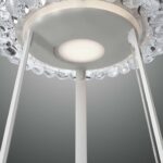 Lampadaire fournissant une lumière diffuse, directe et indirecte. La structure se compose d’arcs en PC transparent, sur lesquels une série de sphères en PMMA sont appliquées à l’aide du nouveau système twist lock. Le corps lumineux est formé de deux plaques d’acier thermolaqué, qui intègrent le panneau de LED à double face, spécialement conçu par Foscarini. La carte LED est installée sur un disque en aluminium qui fait office de dissipateur thermique, la partie supérieure est protégée par un disque en PMMA opale et la partie inférieure par un diffuseur en PMMA satiné. Base circulaire en aluminium moulé sous pression et tiges en aluminium extrudé recouvertes de poudre époxy. Sur le câble transparent se trouve un variateur qui agit à la fois comme un variateur d’intensité et comme un interrupteur marche/arrêt.