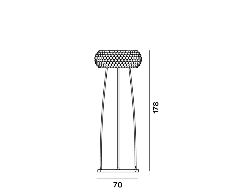 Gioiello di design, scintillante e preziosa, la lampada da terra Caboche Plus ha una base in metallo con disegno circolare che riprende la forma del diffusore. Riprogettata con nuovi archetti, un nuovo sistema di aggancio e nuove sfere.
