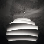 Un véritable centre d’attraction visuelle, la lampe suspendue Le Soleil est composée de bandes irrégulières qui créent un jeu fascinant de lumière réfléchie et diffuse. Une architecture suspendue qui rappelle le profil du musée Guggenheim de New York.