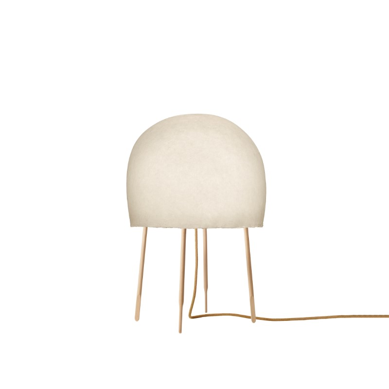 Una lampada da tavolo realizzata in carta washi fatta a mano da artigiani giapponesi, su sottili gambe in frassino, Kurage nasce dalla ricerca della leggerezza nella luce, da cui deriva ogni elemento del progetto.