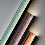 Dalla ricerca Habitus nascono due proposte che oggi entrano a catalogo: una lampada da parete e una da terra, in cui il valore ornamentale e artigianale delle perline policrome dai toni caldi e vivaci e del ricamo incontra il minimalismo contemporaneo della struttura in alluminio che le accoglie. La sorgente luminosa a LED esalta il fascino materico e la leggera imperfezione delle perline in vetro che rivestono internamente le strutture, trasformandole in suggestivi segni luminosi nello spazio.