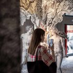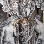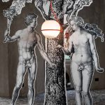 “Deliziare ovvero dare piacere, e perché no, anche agli occhi e al tatto. De-light è dedicato a quel sottile filo che lega tutti noi all’impulso volitivo di possedere qualcosa e alla tentazione che proviamo nel desiderarlo. Ed è proprio alla tentazione e al piacere che ci dà la luce, in tutte le sue forme, che mi sono ispirato per l’allestimento di Foscarini Spazio Monforte; varcata la soglia ci si trova immersi nel Giardino dell’Eden dove assistiamo, come cristallizzata, alla scena di Adamo ed Eva intenti a cogliere il frutto dall’albero del Bene e del Male, in un contesto che sembra scaturire da un’incisione di Dürer. Con questo setup volevo dire che ‘cadere in tentazione’ di tanto in tanto è bello e che design e luce possono a loro volta diventare un oggetto del desiderio”.