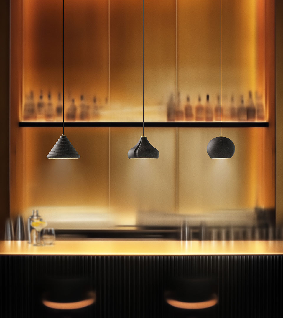 Collezione di lampade in lava colata, sperimentazione innovativa nel settore dell’illuminazione. Realizzate recuperando gli sfridi di lavorazione della pietra lavica, presentano una texture materica unica caratterizzata da imperfezioni, crateri e bolle. Disponibili tre forme, combinabili in serie, che proiettano luce puntuale verso il basso.