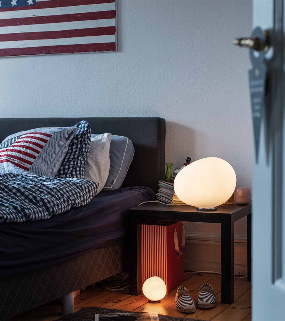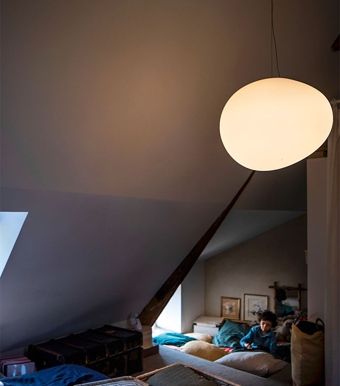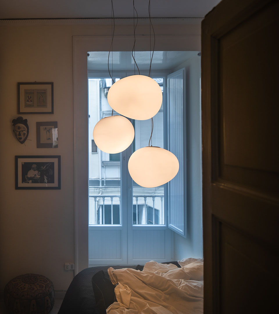 Una forma familiare eppure sorprendente, perché asimmetrica. Funzionale e decorativa, dona un carattere originale ad ogni ambiente. Una collezione di lampade in vetro soffiato satinato fra le più versatili e trasversali.