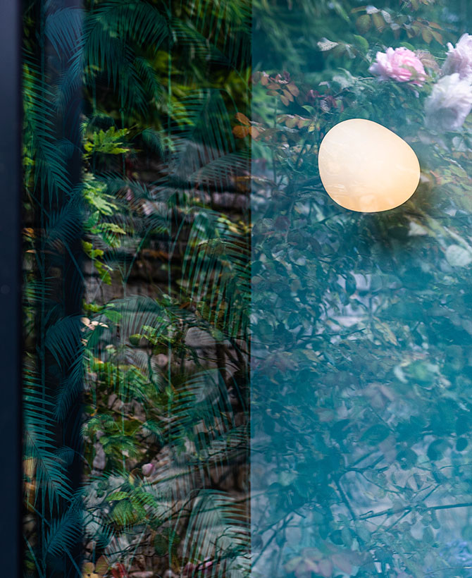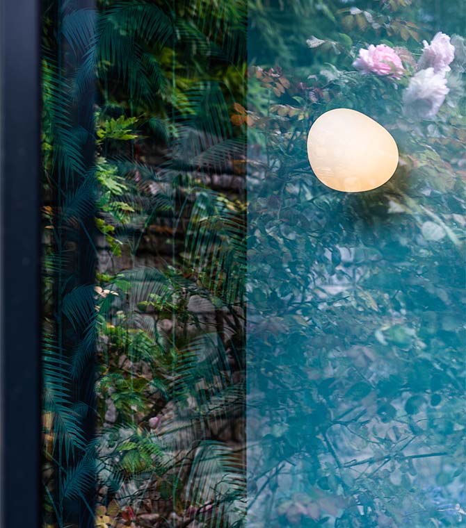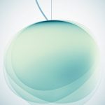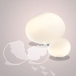 Ricorda un ciottolo levigato dall’acqua, oppure l’uovo di un animale mitologico. Inedita soluzione per un materiale tradizionale come il vetro soffiato, per una lampada che cambia immagine a seconda del punto di vista di chi la osserva.