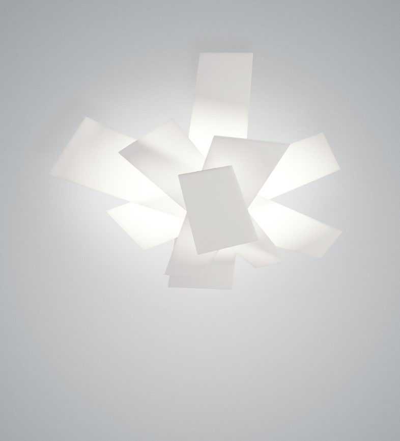 Asimmetrica composizione di forme, Bahia è una lampada da soffitto e parete di grandi dimensioni che decora e illumina con la sua scenografica essenzialità e il suo magico gioco di ombre e bagliori.