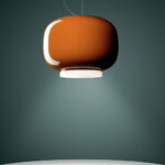 Lampada da sospensione a luce diretta. La famiglia Chouchin è costituita da tre modelli – coordinabili tra loro – che giocano sul contrasto fra il vetro soffiato verniciato lucido, con colorazioni calde e pastose impermeabili alla luce e la parte inferiore bianca che si illumina e diffonde la luce verso il basso. Il diffusore in vetro incamiciato soffiato a bocca è verniciato a liquido coprente a finitura lucida. Supporto del diffusore in policarbonato trasparente stampato a iniezione, cavo di sospensione in acciaio inox e cavo elettrico trasparente. Rosone a soffitto con staffa di metallo zincato e copertura in ABS masterizzato bianco lucido. Disponibile kit per decentramento del rosone.