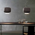 Lampada da sospensione a luce diretta. La famiglia Chouchin è costituita da tre modelli – coordinabili tra loro – che giocano sul contrasto fra il vetro soffiato verniciato lucido, con colorazioni calde e pastose impermeabili alla luce e la parte inferiore bianca che si illumina e diffonde la luce verso il basso. Il diffusore in vetro incamiciato soffiato a bocca è verniciato a liquido coprente a finitura lucida. Supporto del diffusore in policarbonato trasparente stampato a iniezione, cavo di sospensione in acciaio inox e cavo elettrico trasparente. Rosone a soffitto con staffa di metallo zincato e copertura in ABS masterizzato bianco lucido. Disponibile kit per decentramento del rosone.