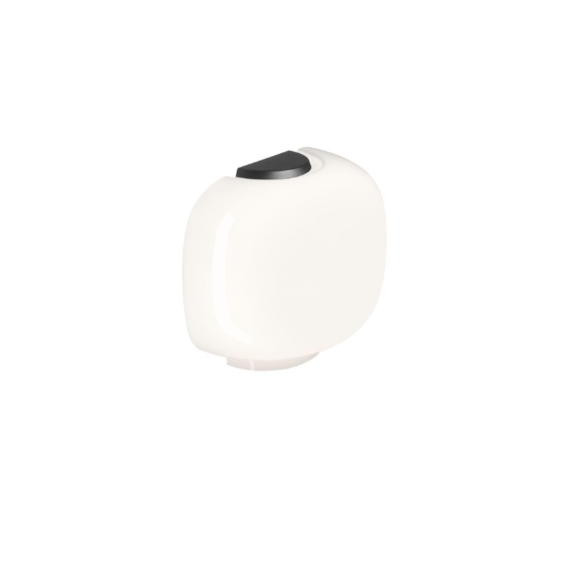 Lampada da parete a luce indiretta e diffusa. Diffusore in vetro incamiciato soffiato a bocca con finitura lucida. Fissaggio a parete in metallo verniciato e ABS.