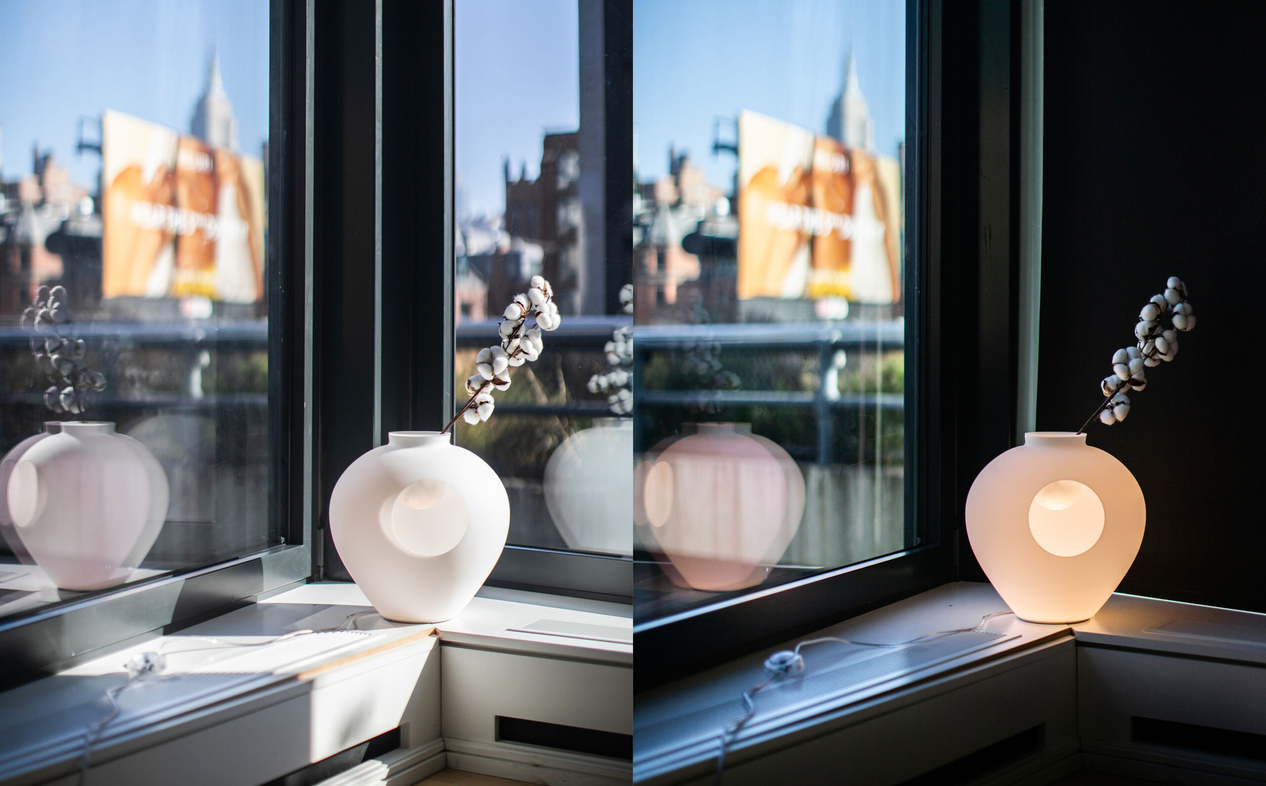La lampada da tavolo Madre è un oggetto poetico e inaspettato. Il foro che interrompe il grande corpo luminoso al centro crea una visione magica e una luce unica. L’incavo superiore contiene un piccolo vaso dove è possibile inserire dei rami per creare una elegante composizione.