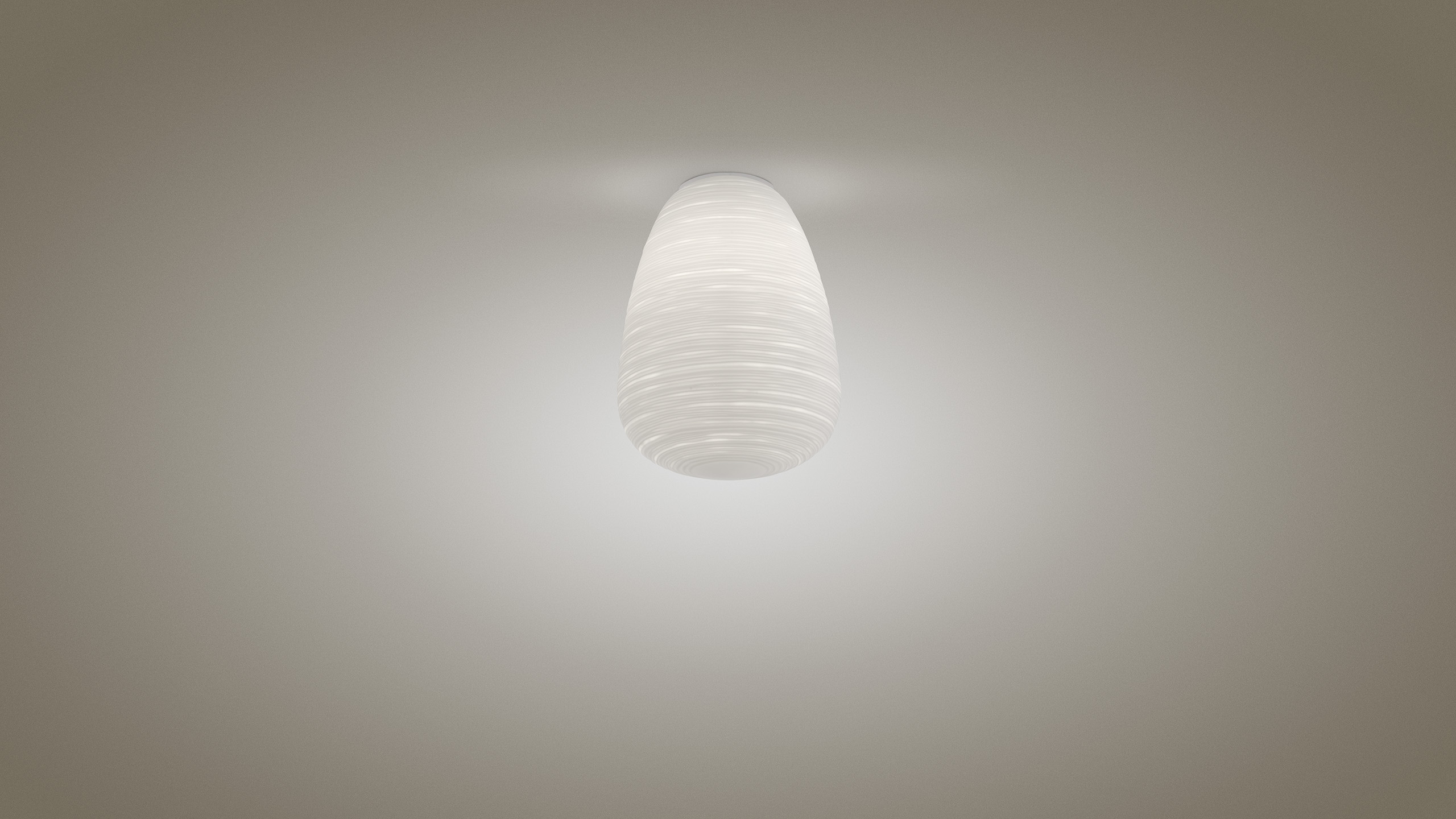 Collezione di lampade da soffitto a luce diffusa. Tre forme di diffusore in vetro soffiato con effetto rigato ottenuto con uno stampo con decorazioni in negativo che vengono ripetute sulla superficie del vetro, in seguito molato a mano a nastro e sottoposto a procedimento di immersione in acido al fine di ottenere l’effetto gessoso. Attacco a soffitto in metallo verniciato a polveri epossidiche.