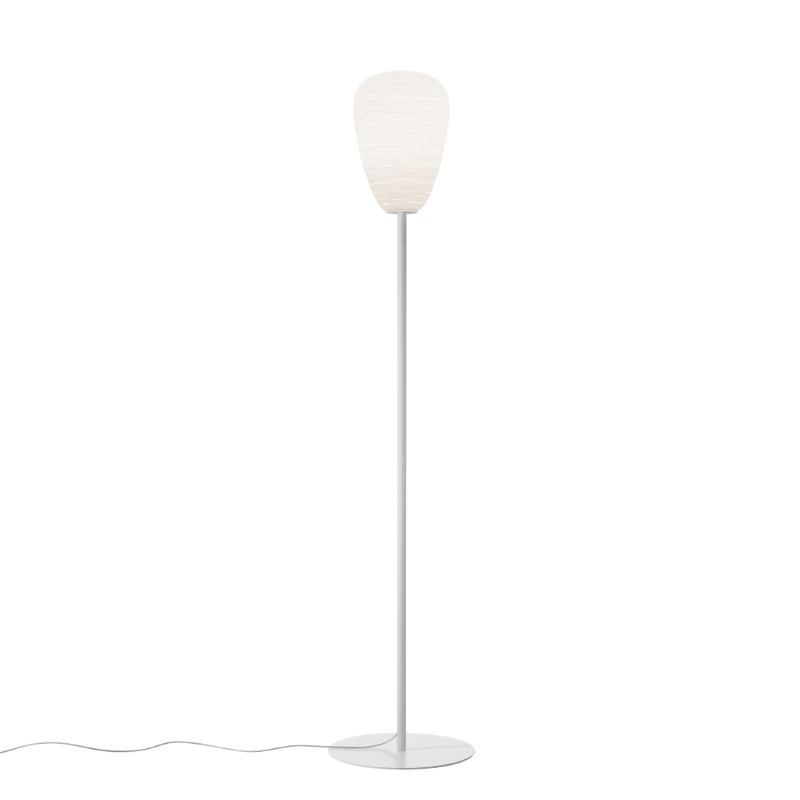 Lampada da terra a luce diffusa. Diffusore in vetro soffiato con effetto rigato ottenuto con uno stampo con decorazioni in negativo che vengono ripetute nella superficie del vetro, in seguito molato a mano a nastro e sottoposto a procedimento di immersione in acido al fine di ottenere l’effetto gessoso. Stelo e base di appoggio con zavorra in metallo verniciato a liquido. Dimmer sul cavo trasparente che consente la regolazione a gradazione della luce.
