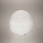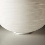Lampada da tavolo a luce diffusa. Vetro soffiato a fermo con effetto rigato ottenuto con uno stampo con decorazioni in negativo che vengono ripetute sulla superficie del vetro. Il vetro è poi molato a mano a nastro e immerso in acido al fine di ottenere l’effetto gessoso. Base di appoggio bianco in metallo verniciato a polveri epossidiche e supporto del portalampada in policarbonato trasparente opaco stampato ad iniezione. Interruttore on/off sul cavo trasparente o con dimmer che consente la regolazione a gradazione.
