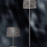 Lampada da terra da esterno a luce diretta verso il basso. Diffusore e stelo in materiale composito su base di fibra di vetro verniciato a liquido. Il diffusore è realizzato da fettucce di materiale composito modellato manualmente sullo stampo, i nastri sovrapposti creano la superficie a intreccio successivamente verniciata a mano. I bordi inferiori e superiori hanno un ulteriore giro di fettuccia a completamento del diffusore. Al centro una lastra in PMMA trasparente, incisa a laser, cattura e diffonde la luce che proviene dai LED multi chip installati sul perimetro della struttura in alluminio che funge da dissipatore. La luce è schermata da un ulteriore disco in PMMA opalino. Base circolare in metallo verniciato a polvere poliestere che garantisce un’ottima resistenza ai raggi UV, agli agenti atmosferici e agli agenti chimici. Cavo elettrico rivestito in neoprene nero per uso esterno senza pulsantiera, trasformatore sul cavo, dotata di spina Schuko e di morsettiera.