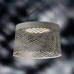 Lampada a sospensione da esterno a luce diretta verso il basso. Diffusore realizzato in materiale composito a base di fibra di vetro e verniciato a liquido. Il diffusore è costituito da nastri di materiale composito piegati manualmente sullo stampo, i nastri sovrapposti creano la superficie tessuta che viene successivamente rivestita a mano. Un ulteriore strato di nastro per completare il diffusore copre i bordi inferiore e superiore. Al centro una lastra di PMMA trasparente incisa al laser cattura e diffonde la luce emessa dai LED multichip installati lungo il perimetro del telaio in alluminio che funge da dissipatore. Un ulteriore disco in PMMA opalino scherma la luce. Dotato di tre cavi di sospensione in acciaio inox e un cavo elettrico rivestito in neoprene nero per uso esterno. Rosone a soffitto, con staffa in metallo zincato e copertura metallica verniciata a polveri poliestere per una maggiore resistenza ai raggi UV, agli agenti atmosferici e agli agenti chimici.